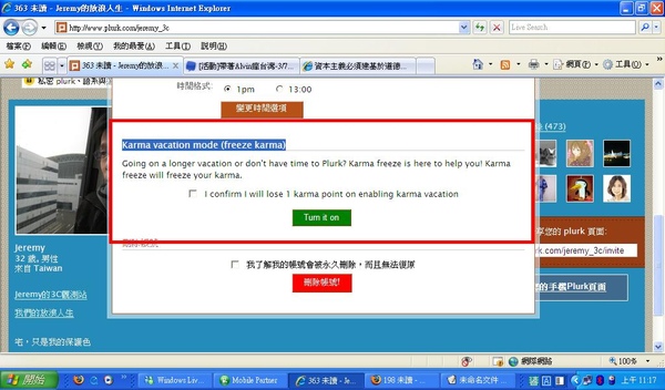 至於要如何操作?這也相當簡單,到河道右上角的「我的帳戶」內,最左邊的「帳戶」最底下,有Karma vacation mode (目前尚未翻譯成中文),只要勾選「I confirm I will lose 1 karma point on enabling karma vacation 」,然後按下「Turn it on」即可。我自己精算過,這個模式對於擁有高Karma值的噗浪客來說,其實並不太划算。因為超過90以上,Karma每次更新只會增加0.01,每天最多增加0.04,扣掉1也就是要花一個多月才補的回來;但對於Karma值相對沒那麼高的朋友來說,這也不失為選擇之一。(真的,Karma沒那麼重要啦)