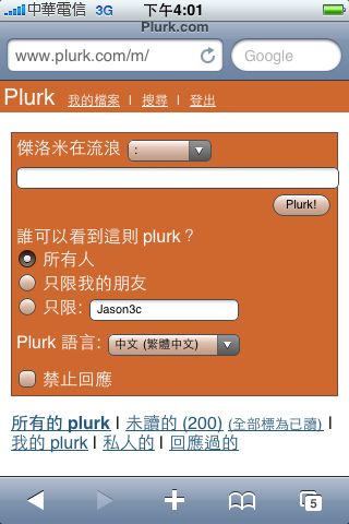 至於《私密Plurk、語系與選項》點開來就變成這樣,可以選擇發私噗,但無法根據帳號去選擇,所以你要記得好友的帳號。如果你要看特定好友的帳號,記得用/m後面家一個 U ,就是www.plurk.com/m/u/帳號就可以了。